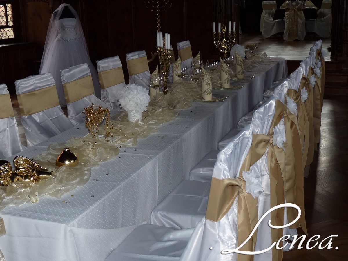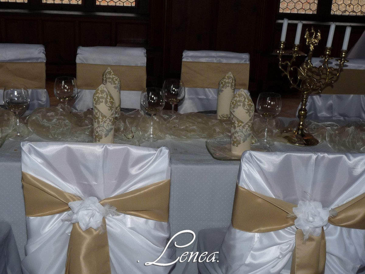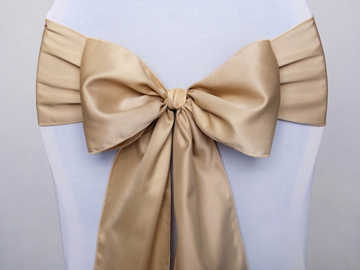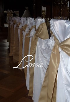 Saténová mašle na židli zlatá-zapůjčení Saténové mašle jsou elegantním doplňkem, který dodá slavnostní vzhled svatebním hostinám, plesům, oslavám i firemním akcím. Lze je použít samostatně nebo v kombinaci s potahy na židle.